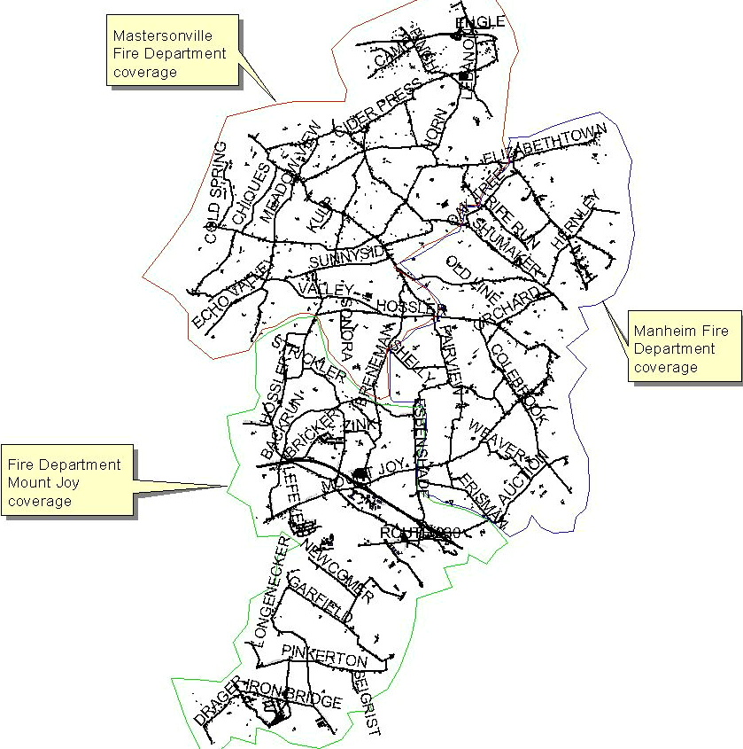 Fire Company Service Areas Mastersonville Fire Company (shown in red) serves the northwestern corner of the township. The Fire Department Mount Joy (shown in green) serves the portion of the township outlying Mount Joy Borough, the lower end of the township and portions of the township located west of Esbenshade Road. Manheim Fire Company (shown in blue) serves the east central portion of the township.